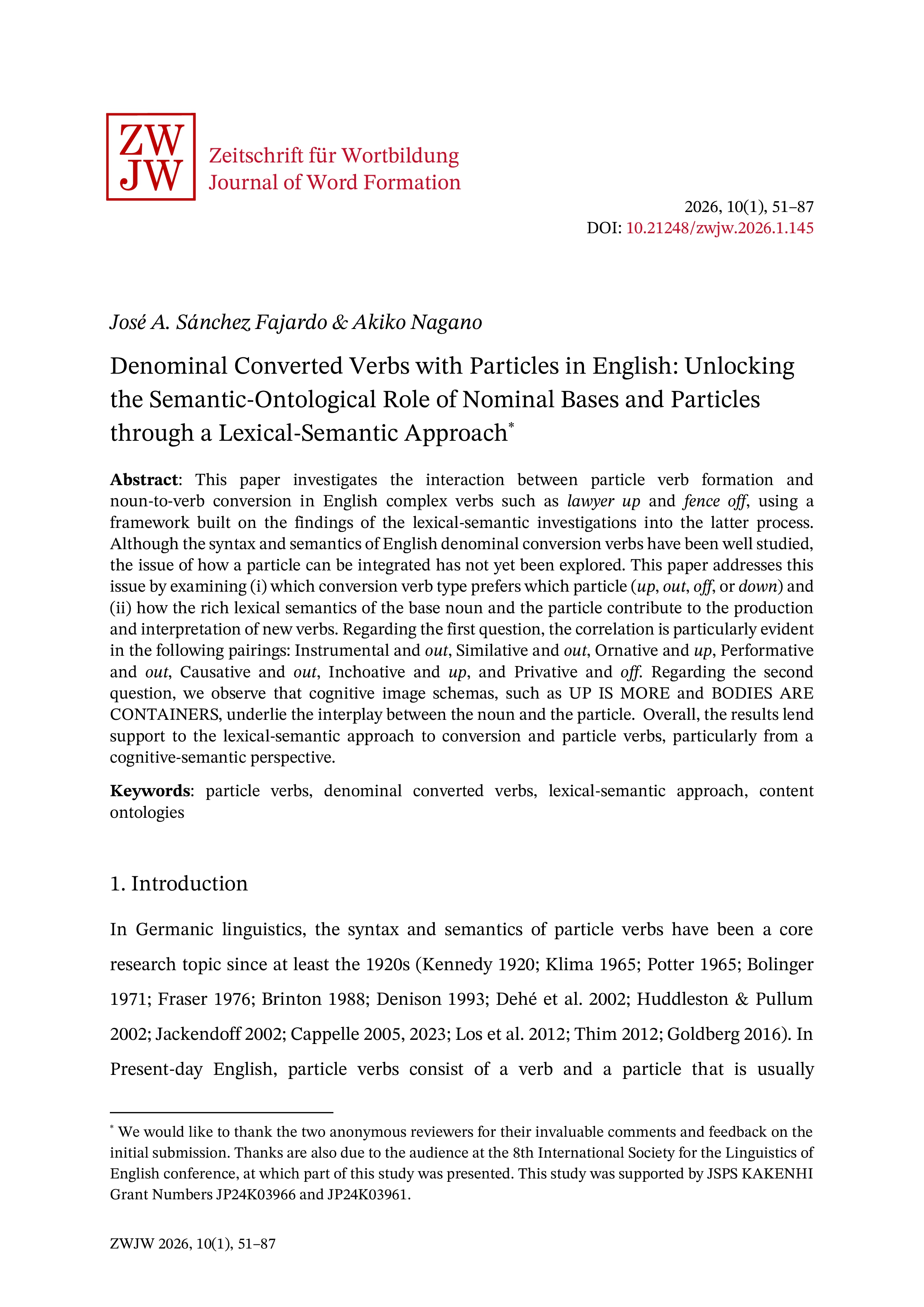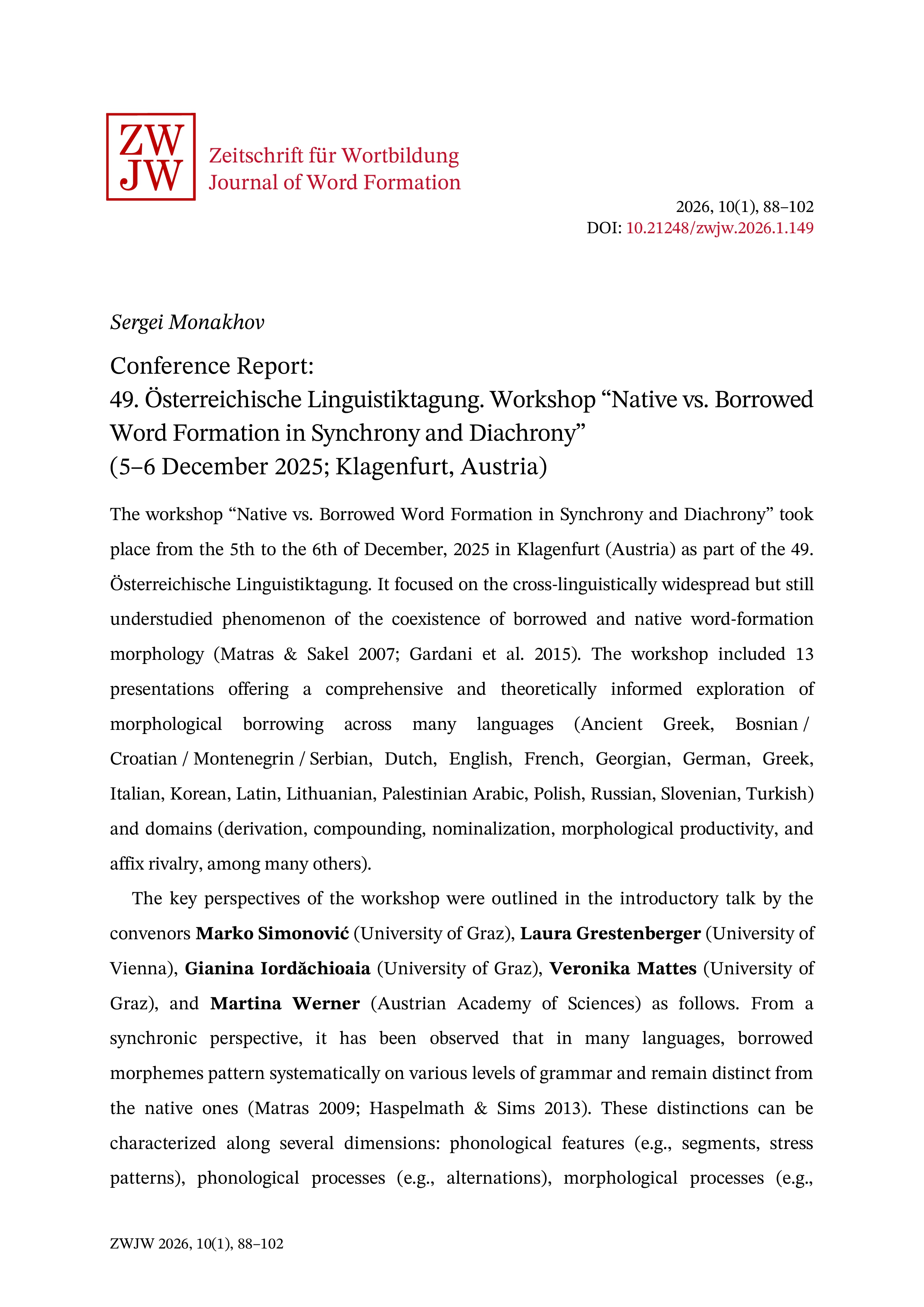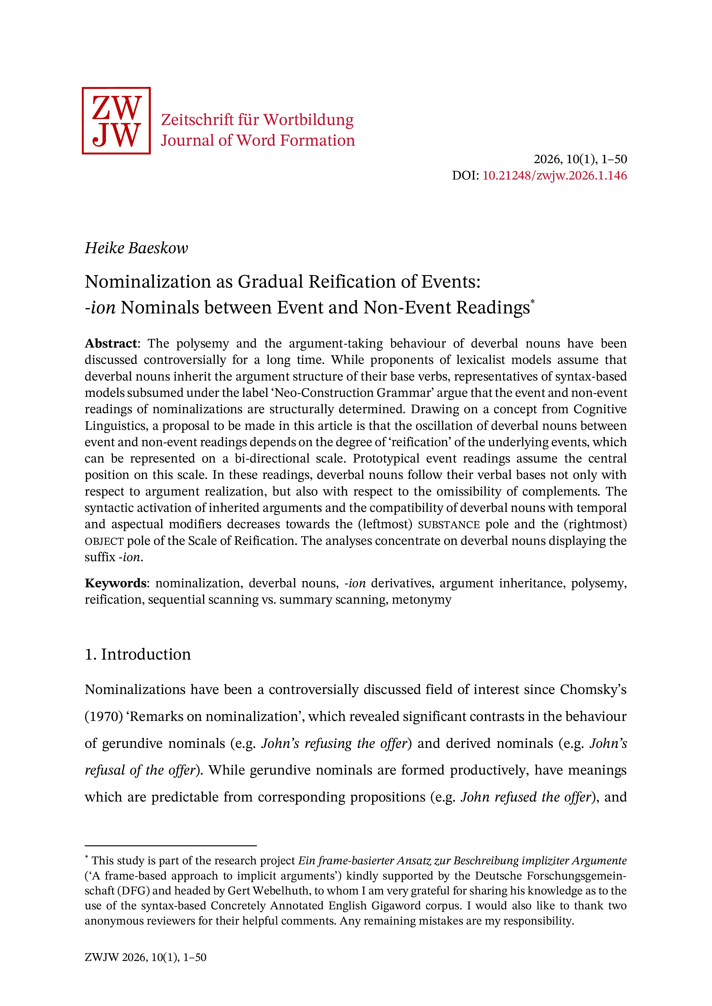 Lesen Sie mehr über Heft 1/2026 erschienenZeitschrift für Wortbildung / Journal of Word Formation (ZWJW) ist eine internationale Open-Access-Zeitschrift mit einem Double-blind-Begutachtungsverfahren. Das Spektrum der Zeitschrift umfasst Wortbildungsphänomene in allen Sprachen und in allen linguistischen Bereichen, z.B. Morphologie, Syntax, Lexikologie, Phonologie, Semantik, Pragmatik, Sprachgeschichte, Typologie, Dialektologie, Spracherwerb und Sprachkontakt.